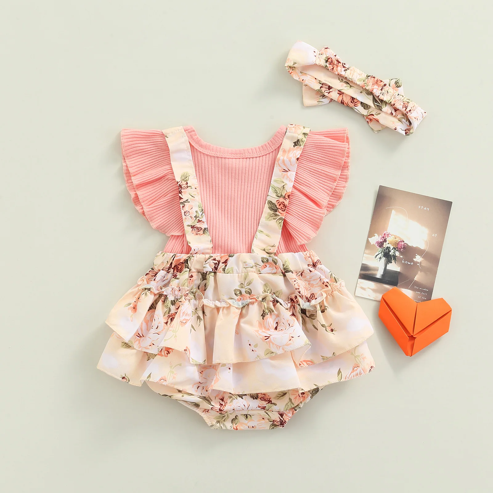 Macacão com gola redonda e mangas com estampa floral rosa e cocar com nó de laço, presentes ideais para meninas.