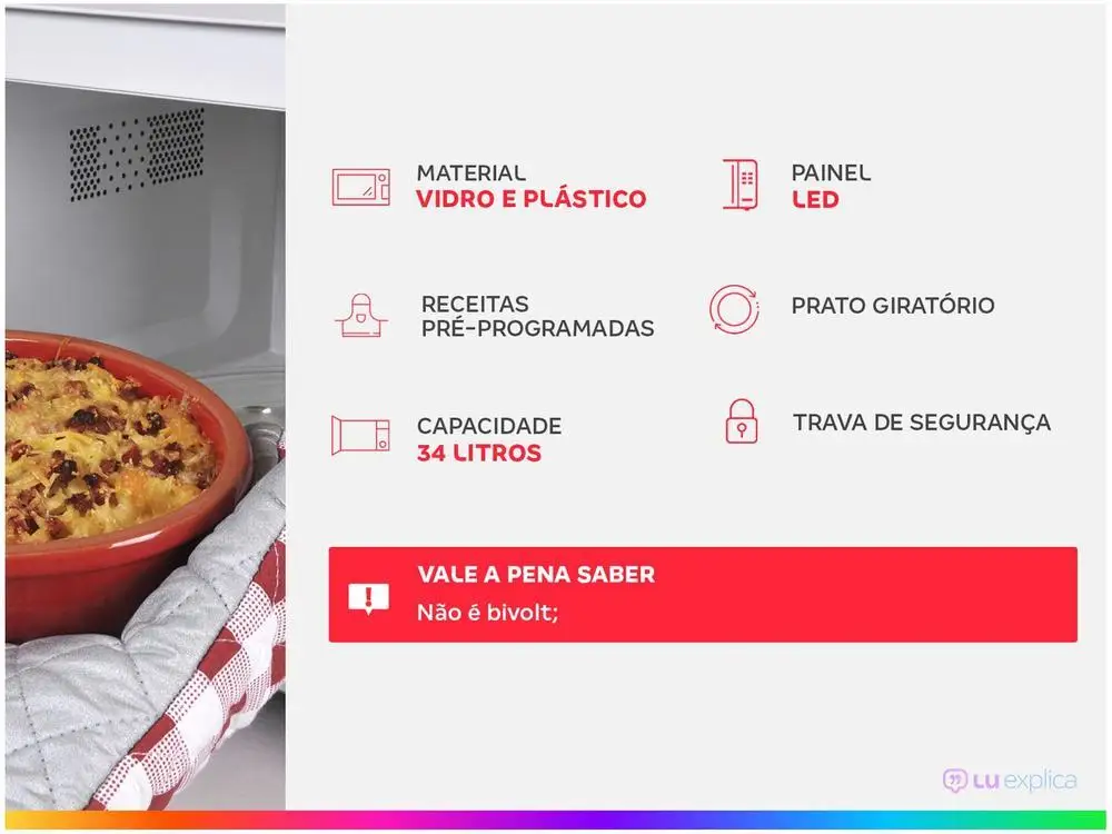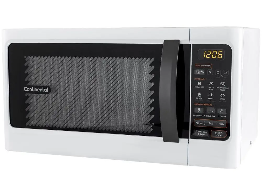 Que o micro-ondas é indispensável para a sua rotina, você já sabe: ele aquece, descongela e faz uma pipoca rapidinho. Mas que ele pode ser ainda melhor, é novidade. O Micro-Ondas Branco 34 Litros com Função Descongelar MC34B – Continental é incrível, a começar pelo espaço, com 34 litros de capacidade, você poderá preparar suas maiores refeições sem preocupação. E não é só no tamanho que ele te surpreende, o Micro-Ondas MC34B possui a função Limpa fácil, que limpa manchas e respingos sem dificuldade. Você limpa tudo muito mais fácil, ganhando muito mais tempo no seu dia-a-dia. Descongelar também ficou mais prático, é só ajustar o tipo de alimento e pronto. E a pipoca? O brigadeiro? Essas e outras receitas já estão programadas, basta apertar o botão que o Micro-Ondas MC34B já sabe o tempo necessário. Até pré-cozinhar o feijão é possível com esse micro-ondas. No Trava Painel, botão Mute, você silencia o som das teclas durante a operação. Já a tecla Início, +30 segundos, ativa o funcionamento do Micro-ondas MC34B imediatamente. Tudo para você ganhar tempo, preparar suas refeições rapidinho e curtir ainda mais a vida.